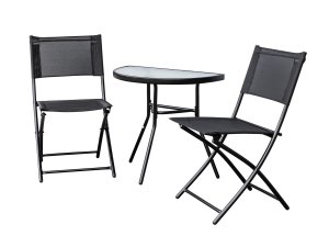 Set zahradní / balkonový MARCO, stůl + 2 židle. set obsahuje: 1 x půlkruhový stůl s prosklenou vrchní deskou, rozměry 70 x 40 x 63 cm 2 x skládací židle, s textilenovým výpletem 2 x 1, rozměry 55 x 45,5 …
