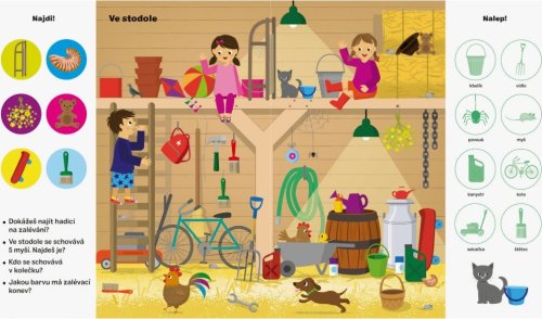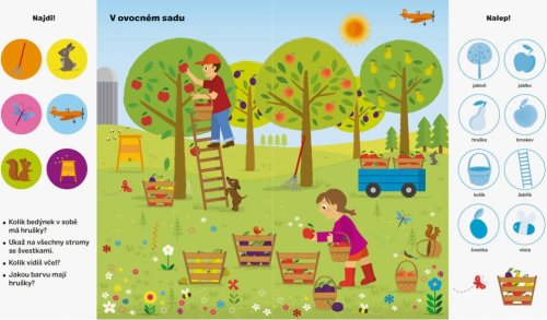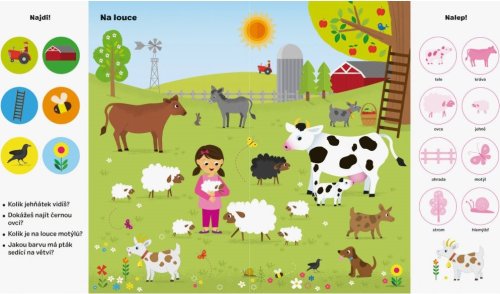 Nic nebaví děti tolik jako hledání obrázků a dolepování samolepek na stránky pracovního sešitu. V tomto sešitě si takové aktivity užije do sytosti - čeká jej totiž přes 101 obrázků. Některé bude nejprve hledat, další pak nalepí. Na každé dvojstraně objeví předměty a zvířata z farmy. Při plnění úkolů a zodpovídání otázek se děti naučí, jak se co nazývá. Pomocí dolepování samolepek na správné místo si také procvičí jemnou motoriku.