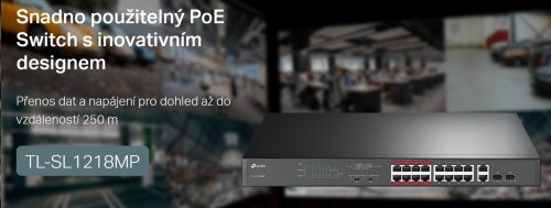 16 portů RJ45 PoE + 10/100Mb/s, 2 gigabitové porty RJ45 a 2 kombinované gigabitové SFP sloty
