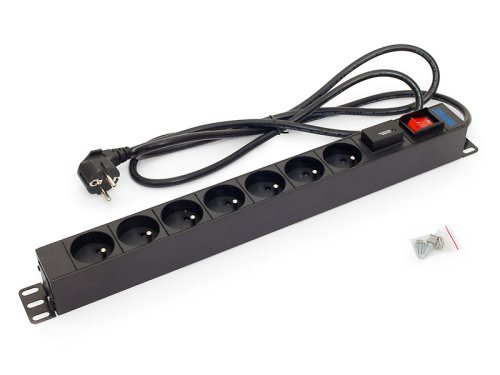 PŘEHLED 19“ rozvodný panel 1U; 7 x zásuvka podle ČSN, max. 16 A; kabel 3 x 1,5 mm, 2 m + zástrčka univerzál CZ-DE max. 16 A; bleskojistka; podsvícený vypínač; RAL 9005; Variabilní úchyty v otočení o 90° PŘÍBAL • Šroub M6 x 16 s podložkou 2x • Plovoucí matice M6 2x