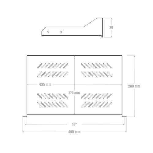Polička s perforací 19" 2U 280 mm - 19" nízkoprofilová police 280 mm s uchycením 2U je vhodná pro umístění do 19" datového rozvaděče s hloubkou 400 mm a hlubšší. - Perforované tělo police umožňuje proudění vzduchu. - Tato police se instaluje pouze na přední vertikální lišty datového rozvaděče. TECHNICKÉ VLASTNOSTI Celková hloubka police: 280 mm Výška uchycení v rozvaděči:: 2U Rozměr úložné plochy police: (š) 435 mm x (h) 270 mm Max. nosnost police: 20 kg Rozměry: (v) 100 mm x (š) 510 mm x (h) 300 mm Hmotnost: 1,64kg Součástí balení je příbal pro uchycení v rozvaděči: 4x klecová matice M6, 4x šroub M6