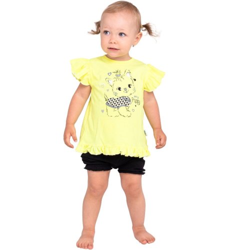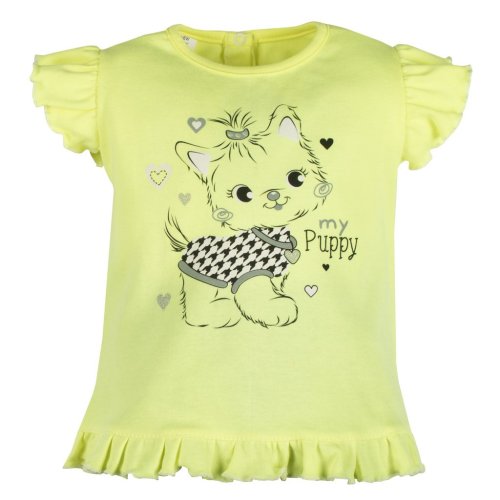 2-dílná bavlněná soupravička New Baby Puppy. Holčičí soupravička obsahuje tričko s krátkým volánkovým rukávkem a pumpkami. Tričko má zapínání na zádičkách na cvočky. Je zdobeno veselým obrázkem pejska s nápisem my Puppy, třpytivými srdíčky a krásnými volánky na rukávech a spodní částí trička. Zadní část je střižená do obloučku aby krásně vynikli volánky na zadní straně pumpek. Super letní hit a krásná vychytávka. Složení 100% bavlna.