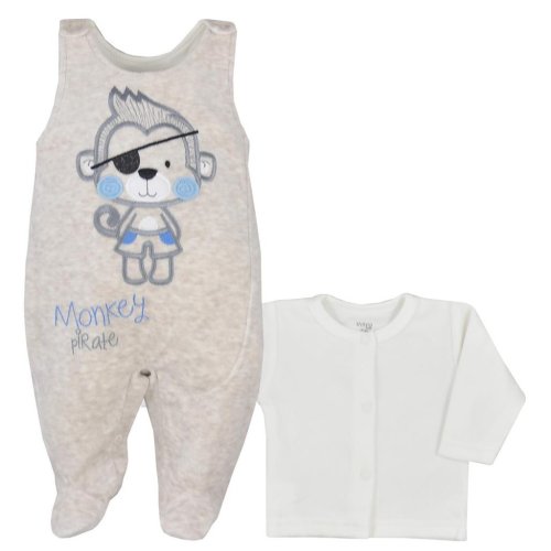 2-dílná semišková soupravička Koala Monkey. Soupravička obsahuje dupačky a kabátek. Dupačky jsou zdobeny roztomilou opičkou a nápisem Monkey. Praktické zapínání na cvočky na ramínku a mezi nožičkami velmi usnadní oblékání a přebalování. Kabátek je jednobarevný, má praktické zapínání na cvočky po celé délce. Materiál: 80% bavlna, 20% polyester.