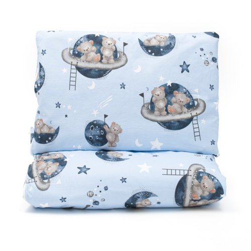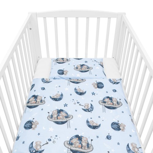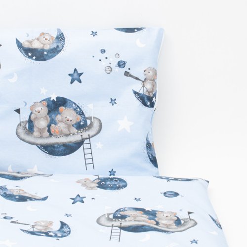 Dětská 2-dílná souprava do postýlky New Baby Teddy bear in space je produktem české značky New Baby. Souprava je vyrobena ze 100% bavlny. Kvalitní provedení a nádherný detský motiv. Obsahuje povlečení na polštářek cca 40x60 cm + povlečení na peřinku cca 120x90 cm. Materiál 100% bavlna.<BR>Tyto výrobky jsou bezpečné, protože:<BR>- přírodní bavlna nezpůsobuje odřeniny a podráždění, jelikož neobsahuje formaldehydy a další prvky, které kojencům škodí<BR>- neztrácí barvu a nezabarvuje oblečení<BR>- nabízené vzory jsou příjemné na pohled a mají uklidňující barvy<BR>- zipy používané u povlečení jsou tvz. "bezpečné zipy" bez volně visící koncovky, kterou by mohlo dítě utrhnout a spolknout<BR>- nejsou použity žádné knoflíky ani žádné další plastové nebo ocelové části, které mohou být pro Vaše dítě nebezpečné<BR>- materiál, který je používán pro výplně polštářů a přikrývek, je 100% protialergický, což znamená, že se v jeho vláknech nešíří žádné mikroorganismy ani plíseň OEKO-TEX STANDARD 100.