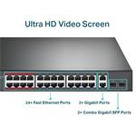 POPIS Switch nabízející 24x Fast Ethernet RJ-45 porty s podporou PoE+ a celkovým napájecím výkonem až 250 W. Dále nabízí dva GbE RJ-45 porty a dva Gbit SFP sloty. Přenos dat a napájení až do vzdálenosti 250 m v režimu "Extend Mode", který je speciálně navržený pro dohledový systém. Prioritní režim pro porty 1-8 zaručuje kvalitu přenosu citlivých aplikací, jako je například video monitor. Snadné použití bez nutnosti konfigurace a instalace (Plug and play). Přepínací kapacita dosahuje až 8,8 Gbps a rychlost směrování až 6,55 Mpps. Buffer má kapacitu 4,1 Mb, tabulka MAC adres 8 K a podporovány jsou Jumbo Frame 10 KB.