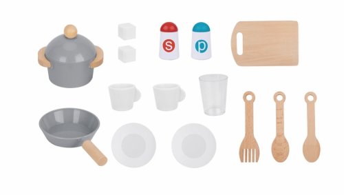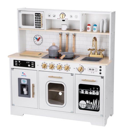 Tato velká dětská kuchyňka je ideální hračkou pro všechny malé kuchaře a kuchařky, kteří milují vaření a chtějí objevovat svět kulinářských dobrodružství. Moderní design v elegantní kombinaci šedé barvy a zlatých doplňků doplňují realistické spotřebiče a bohaté příslušenství, které dětem umožní rozvíjet kreativitu, samostatnost a hru na role.Kuchyňka má pevnou konstrukci ve tvaru obdélníku a nelze ji výškově nastavovat. Na bočních stranách jsou praktické otvory pro snadné nadzvednutí a přemístění celé kuchyňky. Děti zde najdou varnou desku se svítícími plotýnkami, které lze zapínat a vypínat, a také cvakavé otočné knoflíky, které dodávají hře reálný zvukový efekt.Součástí kuchyňky je mikrovlnná trouba s otevíracími dvířky (tlačítka jsou pouze dekorativní), pečicí trouba a myčka nádobí, které fungují jako úložné skříňky. Nechybí ani kávovar, dřez s otočným kohoutkem a prostorná lednice s funkčním výrobníkem ledu. Po vložení dvou kostek ledu do horní části stačí přiložit skleničku zepředu a zatlačit ji směrem dozadu a ledové kostky opravdu spadnou dovnitř, což je oblíbená funkce všech dětí.Kuchyňka je doplněna bohatým příslušenstvím, které zahrnuje hrnec s pokličkou, pánvičku, prkénko, kuchyňské náčiní v podobě 3 kusů vařeček, 2 talířky, 2 hrníčky, skleničku, solničku, pepřenku, dvě kostky „ledu“ a hodiny s otočnými ručičkami. Díky tomu mají malí kuchaři vše potřebné k přípravě i servírování svých kuchařských výtvorů. Hlavní vlastnosti: cvakavý zvuk při otáčení knoflíkůsvítící plotýnky varné desky (lze zapnout/vypnout)otevírací dvířka spotřebičůfunkční výrobník ledu se dvěma kostkamibohaté příslušenství pro hru na vařenírůzné odkládací a úložné prostorymoderní design v šedé barvě se zlatými doplňkyrozvíjí kreativitu, sociální dovednosti a dlouhotrvající hru na rolevyrobeno z FSC® certifikovaného dřeva2xAA baterie nejsou součástí balení Značka a certifikát FSC® (Forest Stewardship Council) zaručuje, že dřevo, ze kterého byl produkt vyroben, nebylo vytěženo nelegálně a pochází z lesů obhospodařovaných šetrným či přírodě blízkým způsobem, ve kterém jsou dodržovány přísné environmentální a sociální požadavky. Značka FSC® na výrobku znamená, že svým nákupem pomáháte chránit lesy a podporujete šetrné, odpovědné či přírodě blízké hospodaření, díky kterému jsou naše lesy stabilnější, zdravější, mají přirozenou druhovou skladbu a lépe odolávají negativním následkům klimatických změn.