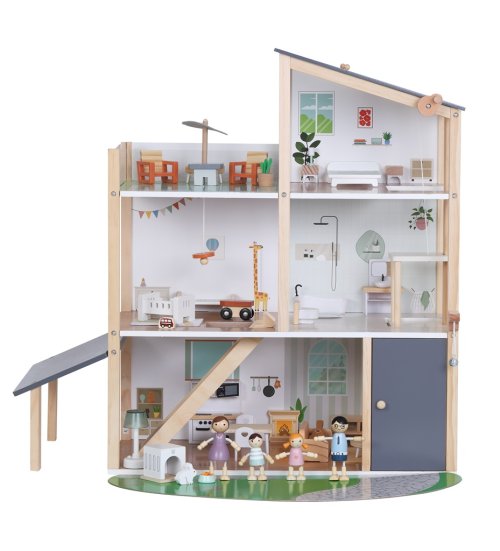 Vítejte v domečku, kde se bydlí jedna radost! Prostorný dřevěný domek je plně vybavený nábytkem i doplňky. Najdete v něm prostornou kuchyni propojenou s útulným obývacím pokojem, stylovou koupelnu s vanou, dětský pokojíček, ložnici i luxusní střešní terasu pro chvíle pohody. A aby toho nebylo málo, nechybí ani výtah. Zatočte kličkou a vyvezte rodinku až do druhého patra. Součástí sady je roztomilý domácí mazlíček králíček s vlastním domečkem a čtyřčlenná rodina připravená zabydlet se a začít psát svůj příběh. Děti si při hře rozvíjejí fantazii, sociální dovednosti i smysl pro detail. A hlavně se výborně baví! Hravý design, jemné barvy spolu s kvalitním provedením dělají z této hračky krásný doplněk každého pokojíčku nebo herny. Domeček je dodáván v rozloženém stavu a vyžaduje montáž. Návod k sestavení je součástí balení. Hlavní vlastnosti: 41 dílůplně vybavený dřevěný domeček se 4 figurkami rodinypodporuje fantazii, tvořivost a hru na rolevede k představivé hřekvalitní zpracování a atraktivní designdodáváno v rozloženém stavu, nutná montážnávod k sestavení je součástí balenívhodné pro děti od 3 let