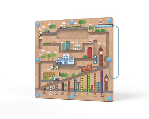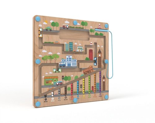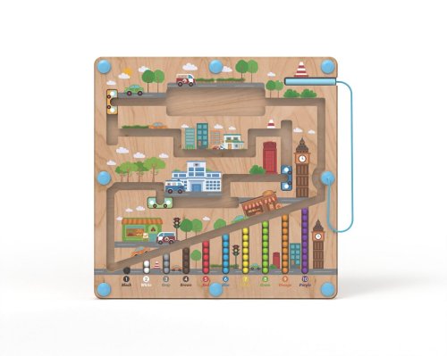 Vydejte se na cestu městem s barevnými kuličkami. Provedete úspěšně různobarevné kuličky všemi zákoutími? K převozu Vám pomohou barevné autobusy. K vedení kuliček se při hře využívá magnetické ukazovátko, které prověří dětskou trpělivost a koordinaci rukou a zraku. Dokážete pak navrátit kuličky zpět na své místo podle barvy? Zábavná dřevěná hra, která pomáhá dětem rozvíjet jemnou motoriku, orientovat se v prostoru a rozšiřovat slovní zásobu pojmenováváním barev a předmětů ve městě. Děti se také učí základy počtů formou hry. Dřevěná základna v designu města je kryta odolnou průhlednou plastovou deskou, hračka je díky tomu bezpečná. Hlavní vlastnosti:•úvod do světa počtů•rozvíjí motorické dovednosti dětí•zábavné i bezpečné díky magnetickému principu