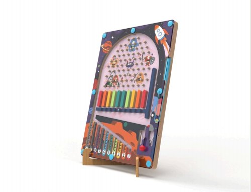 Originální dřevěná hra s vesmírným motivem nabízí dětem hned dvě možnosti, jak si užít spoustu zábavy: klasický pinball s vystřelováním kuliček a magnetickou hru se sbíráním bodů. Barevná hrací deska je navržena tak, aby podporovala zručnost, soustředění a trpělivost. Pomocí vystřelovače (katapultu) se hráči snaží dostat magnetické kuličky co nejpřesněji do vybraných polí a získat co nejvíce bodů. Přehledné uspořádání hrací plochy umožňuje snadné sledování výsledků a zároveň děti učí počítat body. Díky praktickému stojánku lze hru pohodlně postavit na stůl.Zábavná hra, která rozvíjí postřeh, jemnou motoriku a logické myšlení. Ideální pro samostatné hraní nebo zábavné soutěžení s kamarády a rodiči. Hlavní vlastnosti: 2 hry v 1 — pinball + magnetická hrarozvoj jemné motoriky a koordinace ruka–okopodpora trpělivosti, soustředění a logického myšleníprvní seznámení s jednoduchým bodováním a počítánímrobustní a kvalitní provedení ze dřevahravý design s vesmírnými motivy