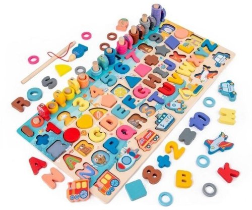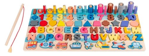 Každý malý šikula si najde to své! Dřevěná multifunkční deska nabízí edukativní hru a pomáhá dětem v koordinaci motoriky, zlepšování koncentrace a rozvoji logického myšlení. Jejím cílem je nejen učení přeměnit na zábavu, ale také vyvinout k učení u nejmenších kladný vztah. Vedle rozpoznávání čísel, tvarů a barev lze v této hře "rybařit" či stohovat kroužky na sebe. Všechny části dřevěné skládačky jsou dimenzovány tak, aby byly ideální pro drobné dětské ruce. Rozměry balení: 46,5 x 23x5 cm Rozměry produktu: 45 x 4 x 22 cm Věk: 3+ Materiál: dřevo Obsahuje: 125 dílů