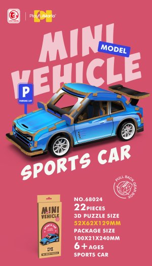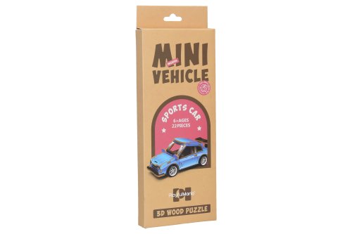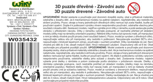 3D puzzle dřevěné - Závodní auto. Rozměry 13x6,2x5,2 cm. 22 dílků. Na zpětné natažení.