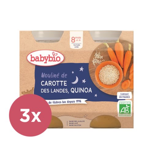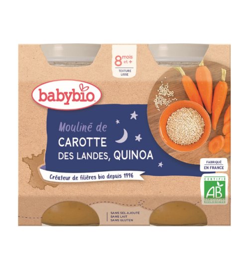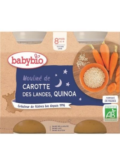 Lahodná kombinace velké porce bio zeleniny a přílohy, která děťátko zasytí, aniž by zatížila před spaním zatížila bříško. Večerní menu plné lahodné chuti pro všechny malé gurmány. Bio říkrm od 8. měsíce. Bio výživa pro kojence od ukončeného 8. měsíce. Malá sklenička, ale spousta chutí! Mrkev z oblasti Landes jsme doplnili sladkými bramborami s italským rajčatovým pyré a quinoou. Praktické večerní menu, které je nutričně vyvážené a obsahuje jen ty nejlepší ingredience.