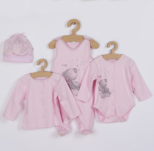 Nádherná bavlněná kojenecká 4-dílná soupravička Koala Angel pro miminka. Soupravička je vyrobena z velmi příjemného, měkkého a kvalitního materiálu, který je vhodný pro miminka a je vhodná nejen do porodnice. Obsahuje body s dlouhým rukávkem, dupačky, kabátek a čepičku. Celorozepínací body zdobí obrázek medvídka. Dupačky zdobí obrázek medvídka a zapínání je na cvočky na ramínkách a mezi nožičkama. Kabátek je jednobarevný se zapínáním po celé délce. Čepička je zdobena puntíky a po obvodu má široký pružný lem, který netlačí na hlavičku miminka a krásně kryje oušká miminka. V této soupravičce, která je precizně a kvalitně ušitá se bude miminko cítit velmi příjemně. Složení: 100% bavlna.