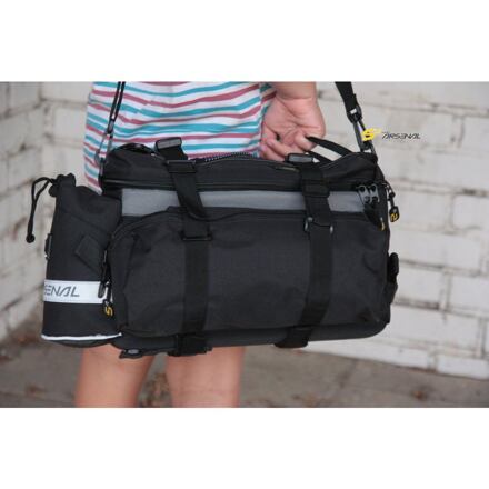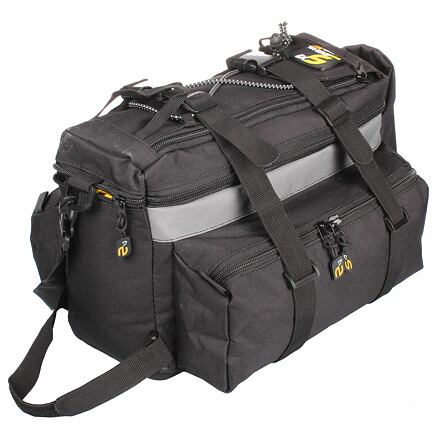 Víceúčelová brašna 450 na zadní nebo přední nosič s možností zvětšení objemu brašny - v případě rozepnutí horního zipu. Brašna o velikosti 40 x 25 x 19-29 cm a objemu 12 l má jednu velkou vnitřní kapsu, dvě postranní vnější kapsy na zip a dvě menší kapsy pro praktické rozložení nákladu. Nasazení brašny k nosiči s horní plochou je snadné za pomoci 3 suchých zipů. Dotažením dvou kompresních popruhů zajistíte stažení vezeného nákladu. Při odepnutí můžete brašnu pohodlně přenášet díky ramennímu popruhu. Brašna 450 je vyrobená z kvalitního voděodolného (ne vodotěsného) materiálu, má pevné skořepinové dno, skvěle tak drží tvar a je stabilní. Součástí brašny je i návlek proti znečištění a menší vlhkosti (není vodotěsný, neslouží jako pláštěnka). Na brašně jsou našité bezpečnostní reflexní prvky pro lepší viditelnost. S praktickou brašnou 450 si svůj cyklovýlet užijete v pohodě a pohodlí. Parametry: Rozměr: d x š x v : 40 x 25 x 19-29 cm, šířka skořepinového dna: 13 cm Objem: až 12 l Úložný prostor: 1 větší kapsa, 2 postranní kapsy a 2 malé čelní Hmotnost: 690 g Uchycení: 3 x suchý zip Materiál: PES s PVC vnitřním zátěrem