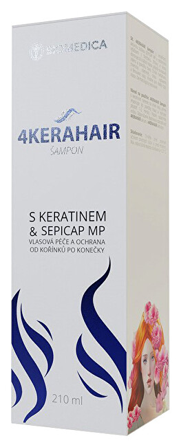 4KERAHAIR Šampon s keratinem a aktivní složkou SEPICAP™ MP a rostlinnými výtažky z břečťanu, kopřivy a břízy obnovuje sílu vašich vlasů, působí na vlasové vlákno a pokožku hlavy. Chrání namáhané, chemicky ošetřené, slunci vystavené a fénované vlasy. Vhodné pro všechny typy vlasů.