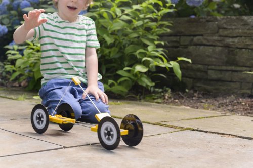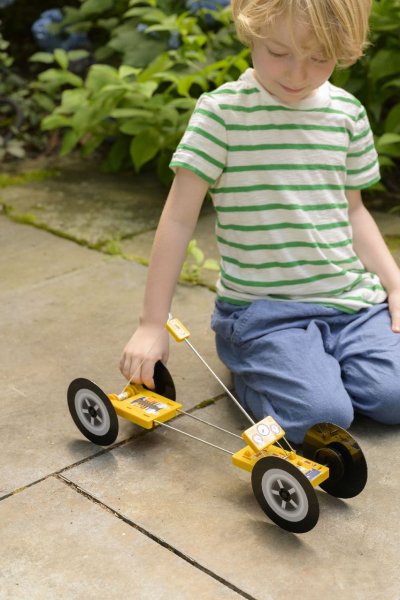 Přeměna energie: Stavebnice učí děti, jak se potenciální energie (uložená v natažené pružině) přeměňuje na kinetickou energii (pohyb auta). Když se pružina uvolní, tahá za provázek, který otáčí nápravou, a tím pohání kola.