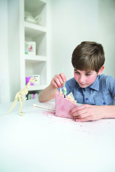 Set pro vykopání a sestavení kostry dinosaura zalité do sádry. Obsahuje potřebné nástroje.