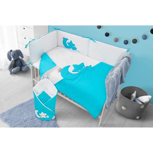 Krásná dětská bavlněná 5-dílná souprava do postýlky Belisima Magic Stars pro miminka. Je vyrobena z měkkého, příjemného materiálu. Souprava obsahuje povlečení na polštářek cca 40x60 cm, povlečení na peřinku cca 100x135 cm, mantinel cca 180 cm, výplň polštářek a peřinka. Materiál 100% bavlna.<BR>Tyto výrobky jsou bezpečné, protože:<BR>- přírodní bavlna nezpůsobuje odřeniny a podráždění, jelikož neobsahuje formaldehydy a další prvky, které kojencům škodí<BR>- neztrácí barvu a nezabarvuje oblečení<BR>- nabízené vzory jsou příjemné na pohled a mají uklidňující barvy<BR>- zipy používané u povlečení jsou tzv. "bezpečné zipy" bez volně visící koncovky, kterou by mohlo dítě utrhnout a spolknout<BR>- nejsou použity žádné knoflíky ani žádné další plastové nebo ocelové části, které mohou být pro Vaše dítě nebezpečné<BR>- materiál, který je používán pro výplně polštářů a přikrývek, je 100% protialergický, což znamená, že se v jeho vláknech nešíří žádné mikroorganismy ani plíseň.