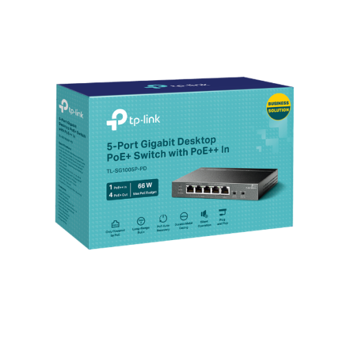1 gigabitový port PoE++ In a 4 porty PoE+ Out: Podporuje rozpočet výstupného PoE napájania až 66 W / 47 W / 21 W / 9 W PoE pri vstupnom PoE napájaní podľa štandardu 802.3bt Type 4, 802.3bt Type 3, 802.3at. v tomto poradí*