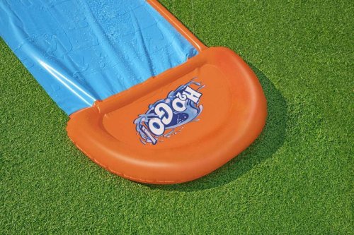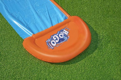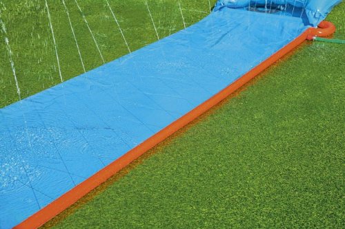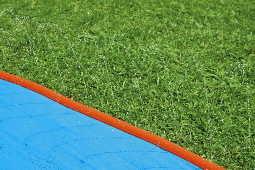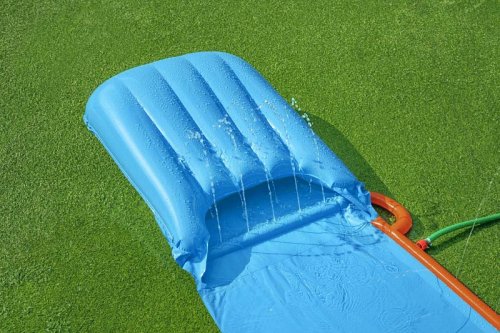 Připojte se pomocí adaptéru k zahradní hadici a jízda začíná. Téměř pětimetrová skluzavka je ideální pro závodění s kamarády.