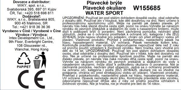 Upozornění: Tyto plavecké brýle nejsou záchrannou pomůckou a nechrání před utonutím. Nesprávné použití může vést k poranění očí. Varování: Tento produkt je osobní ochranný prostředek (OOP) a splňuje požadavky nařízení EU o osobních ochranných prostředcích (EU) 2016/425. Používejte pouze ve vodě pod dohledem dospělé osoby. Věkové omezení: Vhodné pro osoby od 14 let.