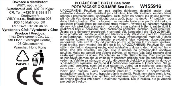 vyrobeny z hypoalergenního PVC, který je příjemný na dotyk průhled je vyroben z polykarbonátu brýle mají nastavitelný pásek pro každý obvod hlavy výrobek neobsahuje latex Doporučený věk: od 8 let