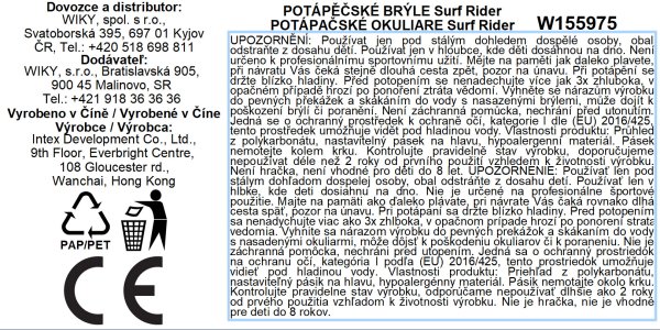 Upozornění: Používejte pouze pod dohledem dospělé osoby. Není určeno jako záchranná pomůcka. Před každým použitím zkontrolujte, zda nejsou brýle poškozené. Poškozené brýle nepoužívejte. Výrobek splňuje obecné bezpečnostní požadavky EU a požadavky směrnice EU o bezpečnosti hraček. Věkové omezení: Vhodné pro děti od 3 let.