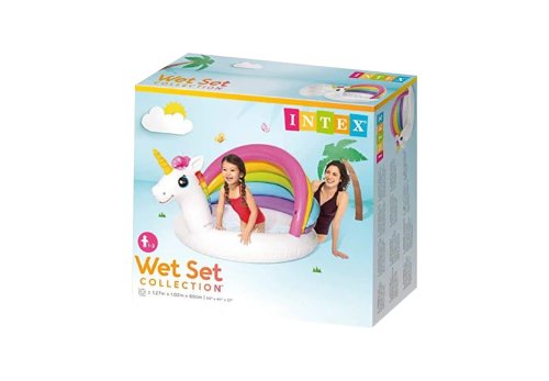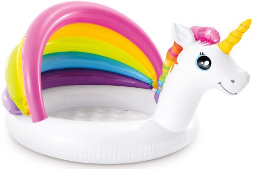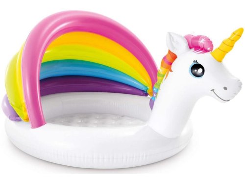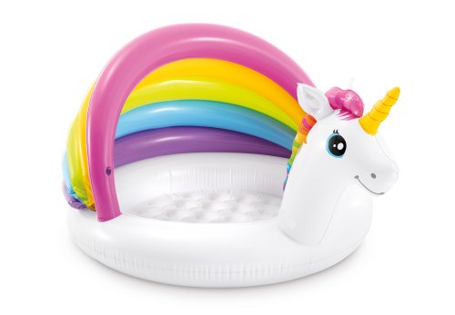 Bazén se stříškou jednorožec. Rozměry 127 x 102 cm. Kapacita 45 L při výšce hladiny 13 cm.