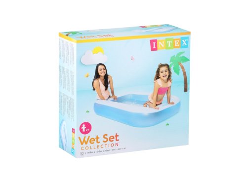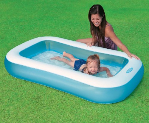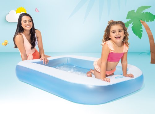 Dětský nafukovací bazének v modro – bílém provedení obdélníkového tvaru pro horké letní dny. Bazén s měkkou nafukovací podlahou zpříjemní koupání vašim dětem. Bazén je vyroben z kvalitního masivního vinylu o tloušťce 0,30 mm. Je vhodný nejen na zahradu, ale třeba také na balkón nebo terasu. Objem vody při výšce hladiny 17 cm činí 90 litrů. Pro drobná poškození je součástí balení opravná sada.