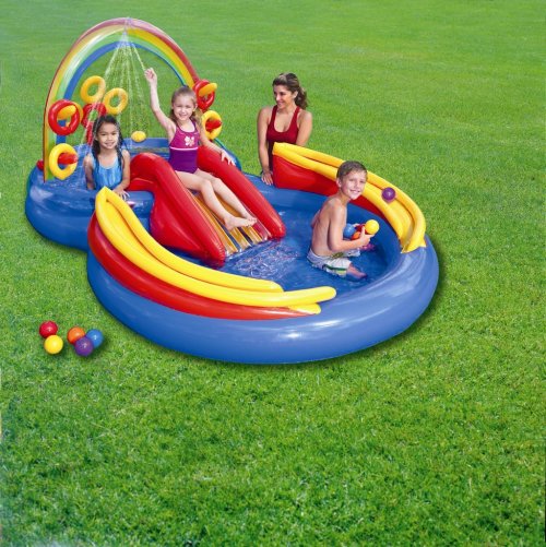Dětské hřiště - skluzavka obsahuje 2 hlavní části, spojené skluzavkou. V obou částech se lze koupat, herní doplňky zpestří mrňousům zábavu. Nad skluzavkou je připevněna mini sprcha pro snadné klo