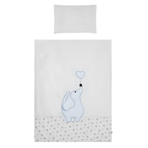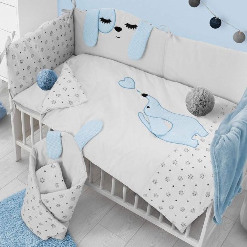 Krásná dětská bavlněná 6-dílná souprava do postýlky Belisima Lovely Puppy pro miminka. Souprava je zdobena krásným roztomilým pejskem. Je vyrobena z měkkého, příjemného materiálu. Souprava obsahuje povlečení na polštářek cca 40x60 cm, povlečení na peřinku cca 100x135 cm, mantinel cca 180 cm, výplň polštářek a peřinka, nebesa. Materiál 100% bavlna.<BR>Tyto výrobky jsou bezpečné, protože:<BR>- přírodní bavlna nezpůsobuje odřeniny a podráždění, jelikož neobsahuje formaldehydy a další prvky, které kojencům škodí<BR>- neztrácí barvu a nezabarvuje oblečení<BR>- nabízené vzory jsou příjemné na pohled a mají uklidňující barvy<BR>- zipy používané u povlečení jsou tzv. "bezpečné zipy" bez volně visící koncovky, kterou by mohlo dítě utrhnout a spolknout<BR>- nejsou použity žádné knoflíky ani žádné další plastové nebo ocelové části, které mohou být pro Vaše dítě nebezpečné<BR>- materiál, který je používán pro výplně polštářů a přikrývek, je 100% protialergický, což znamená, že se v jeho vláknech nešíří žádné mikroorganismy ani plíseň.