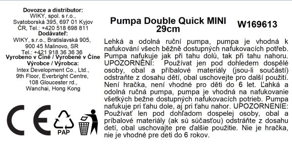 Přenosná ruční mechanická vzduchová mini pumpa. Pumpuje vzduch při tahu vzhůru i při pohybu dolů Flexibilní hadička se 3 násadami je použitelná pro většinu ventilků. Vhodná na foukání malých bazénků, míčů, rukávků a dalších menších nafukovacích potřeb. Vhodné od 3 let.