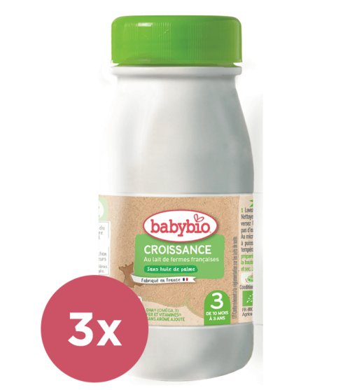 Pokračovací mléčná kojenecká výživa CROISSANCE 3 tekutá a mléčná bio potravina tekutá pro batolata. Upraveno metodou UHT (ultra heat temperature). Výrobek ekologického zemědělství. Obsahuje mastné kyseliny Omega 3 (DHA). Určeno pro zvláštní výživu kojenců od ukončeného 10. měsíce. S ohledem na specifické potřeby dítěte mezi 10. měsícem a 3 roky je BABYBIO CROISSANCE vhodnější než kravské mléko. Výrobek dodává dítěti železo potřebné k vývoji imunitního systému a vitamín D ke stavbě kostí. BABYBIO CROISSANCE 3 je bio kojenecké mléko vyrobené ve Francii z mléka krav francouzského původu, které jsou krmeny travinami nebo krmivem a jsou chovány s ohledem na dobré životní podmínky zvířat v souladu s ekologickými předpisy. Důležité upozornění: Potravina by měla tvořit pouze část smíšené stravy a není je vhodné ji používat jako náhradu mateřského mléka během prvních 6 měsíců života. Výjimku z pravidla 6 měsíců lze udělat pouze na základě doporučení lékaře nebo osoby kvalifikované v oblasti kojenecké výživy, farmacie nebo péče o matku a dítě, v závislosti na individuálním růstu a vývojových potřebách konkrétního jedince. Vyrobeno ve Francii.