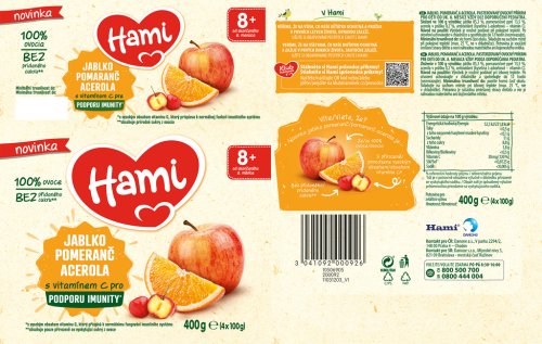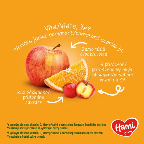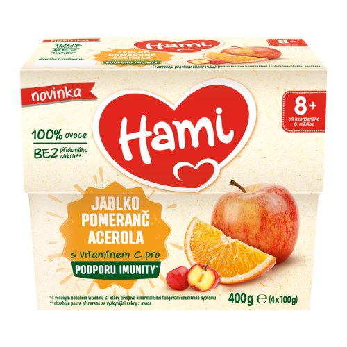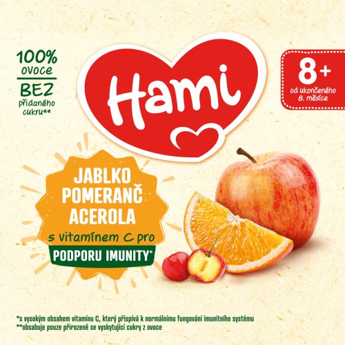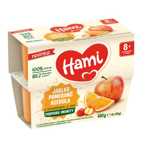 Nové ovocné kelímky Hami jablko pomeranč acerola obsahují vysoké množství vitamínu C, který přispívá k normálnímu fungování imunitního systému, a jsou vhodné pro děti od ukončeného 8. měsíce věku. Navíc obsahují 100% pečlivě vybraného ovoce a žádný přidaný cukr, pouze přirozeně se vyskytující cukry z ovoce.