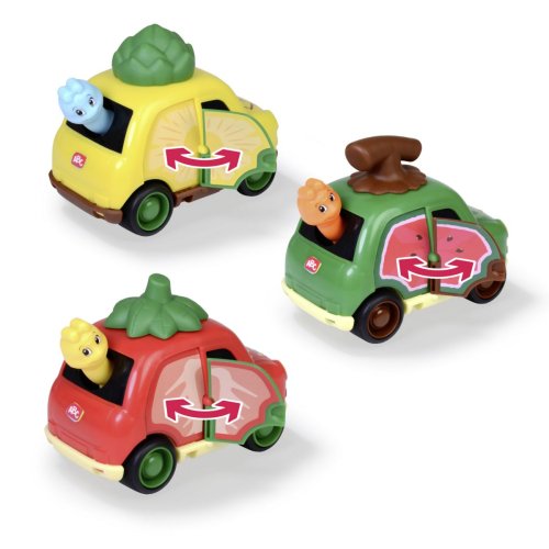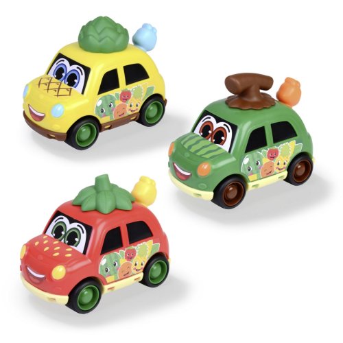Autíčko s motivem ovoce na volnoběh, natahovací hrací strojek na střeše autíčka, pohyblivé dveře a pohyblivý červík. 3 druhy - ananas, meloun, jahoda. Velikost autíčka 12 cm.