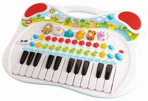 Piánko s různými zvukovými efekty a funkcemi. S barevnými tlačítky a velkou samolepkou s roztomilými motivy zvířátek. Barevné knoflíky zvířátek ve tvaru koníka, ovečky, ptáčka, kachničky, pejska a kravičky. Stisknutím klávesy děti poznají příslušné zvuky zvířat a mohou je napodobit nebo zapojit zvířecí zvuky do svých skladeb. Kromě zvuků zvířat má dětská klávesnice řadu dalších funkcí. Můžete přehrávat různé skladby a melodie, měnit rytmus nebo nahrávat skladby a přehrávat je. Je to nejen velká zábava, ale také trénink sluchu, smyslu pro rytmus a motoriky. Tvořte hudbu, učte se a objevujte. Díky praktické rukojeti pro přenášení lze snadno přenášet. Rozměry: 38 x 32 cm.