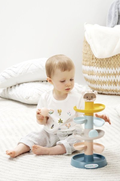 Věž k sestavení pro nejmenší v jemných barvách s míčky a hlavou medvídka na vrcholu. Trénuje motoriku a koordinaci dítěte. Rozměry věže (DxŠxV): 16,5 x 16,5 x 34 cm.
