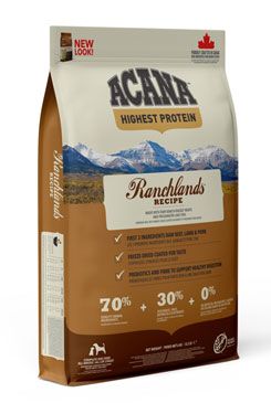 ACANA RANCHLANDS OBSAHUJE ANGUSKÉ HOVĚZÍ, VOLNĚ CHOVANÁ JEHŇATA, BIZONY A YORKSHIRSKÉ VEPŘOVÉ, VŠE DODÁVANÉ ČERSTVÉ NEBO SYROVÉ Z NAŠEHO REGIONU V PODÍLU CELÉ KOŘISTI, COŽ DODÁVÁ ŽIVINY PŘIROZENĚ, BEZ POTŘEBY DLOUHÉHO SEZNAMU UMĚLÝCH DOPLŇKŮ. S NÍZKÝM OBSAHEM SACHARIDŮ A VYSOKÝM OBSAHEM ŽIVOCIŠNÝCH PROTEINŮ PRO DOSAŽENÍ VRCHOLOVÉ KONDICE.