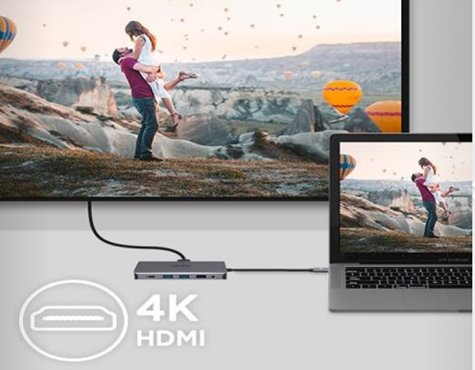 Docking Station 12v1 podporuje napájení notebooků, vybavených podporou Display port over USB-C, a to s použitím zdroje USB-C s funkcí Power Delivery.