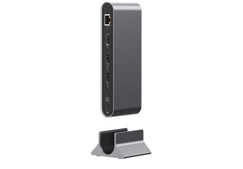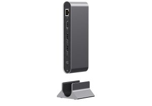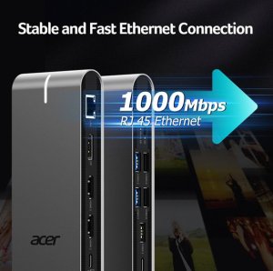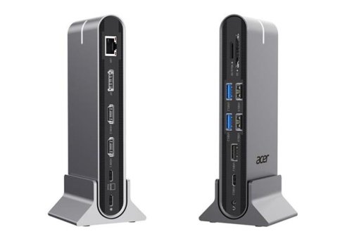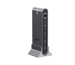 Acer 15in1 USB Type-C Universal Mini-dock: Host interface: USB-C, 2x USB-A 2.0, 1x USB-A 3.2 Gen2, 1x USB-A 3.2 Gen1, 1x USB-C Gen1, 1x USB-C Gen2, 2x HDMI (4K@60Hz max), 1x Display port (8k@30Hz max), 1x RJ-45 1 Gb/s, 1x 3.5 mm combo audio jack, 1x SD 3.0, 1x micro SD1x micro SD, Power delivery: up to 100 W (No adapter included), rozměry: 162 x 60 x 60 mm, hmotnost 300 g, stojánek, Dark Grey color