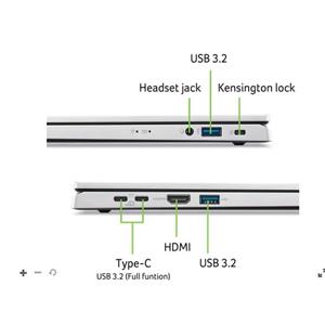 Aspire Go 15 (AG15-32P-38E6) - ESHELL Linux (Boot-up only) - Intel® Core™ 3 processor N355 - 8 GB DDR5 Memory + N/A - 512GB PCIe NVMe SSD PM4 + N/A - 15,6" FHD 1920x1080 TN Anti-Glare - Intel® Graphics - Wifi 6 802.11AX + BT 5.1 - HD USB TNR Camera with 2Mic. - 2x USB Type-C™ port supporting: USB 3.2 Gen 2 (up to 10 Gbps) / DisplayPort over USB-C / USB charging 5 V; 3 A / DC-in port 19 V; 45 W - 2x USB 3.2 Gen1 - HDMI 2.1 - 53Wh Li-ion battery - 65W USB Type-C AC Adapter PCR50% TCO9.0 - Pure Silver