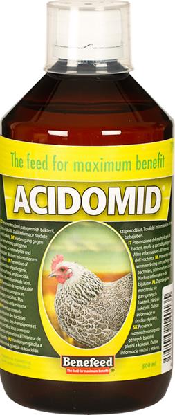 ACIDOMID® je špičkový výrobek moderní koncepce působící nejen proti množení patogenních bakterií, ale velice dobře také tlumí rozvoj a množení nitrobuněčných parazitů jako např. kokcidií. ACIDOMID® však není léčivo, neobsahuje ani kokcidiostatika a nezanechává tak rezidua v organismu. Nemá také ochranné lhůty.