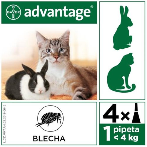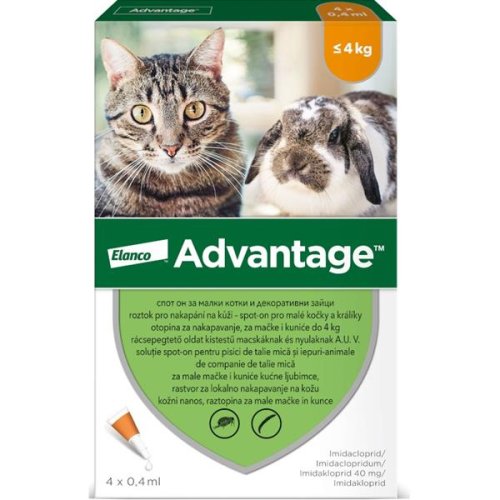 Příbalová informace: Prevence a léčba napadení koček blechami. Přípravek se může aplikovat jako součást léčby alergické dermatitidy vyvolané blechami (FAD). Léčba napadení králíků blechou kočičí (Ctenocephalides felis) při společném chovu králíků a psů/koček v domácnosti. Charakteristika: Způsob účinku Advantage je v navázání se na nikotinový receptor hmyzu umístěný na postsynaptickém neuronu. Tato skutečnost způsobí ireparabilní změny na nervovém systému hmyzu a jeho smrt. Složení - účinné látky: Imidaclopridum 40 mg v pipetě 0,4 ml. Složení - pomocné látky: Propyleni carbonas, Butylhydroxytoluenum, Alcohol benzylicus. Indikace/použití: Cílový druh zvířat: Kočky a králíci Prevence a léčba napadnutí koček a králíků blechami. Jedno ošetření chrání před dalším napadnutím blechami 3-4 týdny. Lék se může aplikovat jako součást léčby alergické dermatitidy vyvolané blechami (FAD). Kontraindikace: Nepoužívat u koťat do 8 týdnů věku. Nepoužívat u králíků do 10 týdnů věku nebo do váhy 1,2 kg. Nepoužívat u králíků určených k lidské spotřebě. Nepoužívat v případě přecitlivělosti na léčivou látku nebo na některou z pomocných látek. Nežádoucí účinky: Nejsou známy. Interakce: Lze použít během březosti a laktace. Dávkování: Do 4 kg ž.hm. 1 pipeta po 0,4 ml. Způsob použití: Pouze pro vnější použití. Přípravek nesmí být aplikován perorálně. Zamezte kontaktu obsahu pipety s ústní dutinou ošetřovaného zvířete. Zabraňte právě ošetřeným zvířatům, aby se olizovala. Aplikace u koček Rozhrňte srst na krku kočky při bázi hlavy, aby byla viditelná kůže. Špičku pipety přiložte na kůži a aplikujte obsah přímo na kůži několikerým stlačením pipety. Aplikace u králíků Rozhrňte srst na krku králíka při bázi hlavy, aby byla viditelná kůže. Špičku pipety přiložte na kůži a aplikujte obsah přímo na kůži několikerým stlačením pipety. Upozornění: Není určeno pro potravinová zvířata.