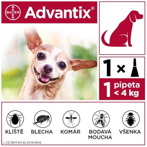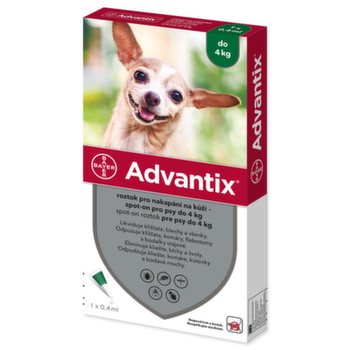 Advantix spot on je vhodný k léčbě a prevenci napadení blechami a klíšťaty pro psy o hmotnosti 1,5-4kg Působí repelentně na bodavý hmyz, proto se skvěle hodí při pobytech u vody v letních měsících Přípravek chrání vašeho mazlíčka 4 týdny proti blechám a až 4 týdny proti klíšťatům a bodavému hmyzu Je vhodný i léčbě alergie na bleší kousnutí (FAD) Vhodný pro psy od 7 týdnů věku Vhodný i pro gravidní a kojící Nepoužívat u koček!