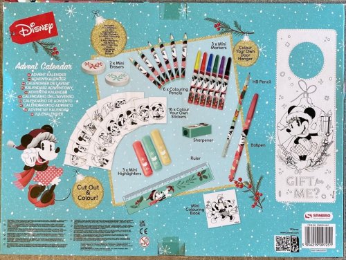 Adventní kalendář – obsahuje 6× pastelky, 6× fixy, 2× gumu, 2× aršík se samolepkami, 1× poznámkový bloček, 1× razítko, 1× HB tužku, 1× propisku, 1× ořezávátko, 3× mini zvýrazňovač.