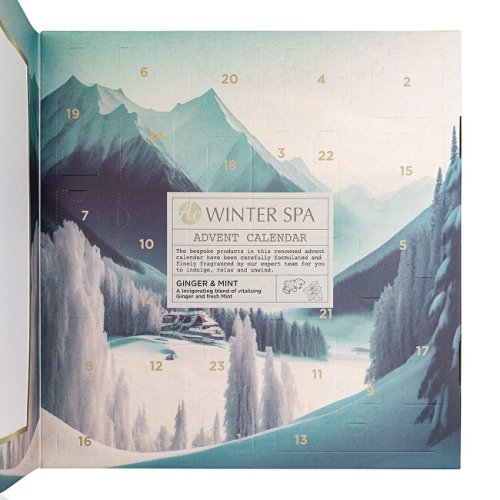 Adventní kalendář obsahuje: 1. Tělové mléko 2. Konfety do koupele 3. Pěna do koupele 4. Mýdlo 5. Kartáček na nehty 6. Bomba do koupele 7. Krém na nohy 8. Mýdlo 9. Olej do koupele10. Pemza11. Bomba do koupele12. Tělový peeling13. Pilník na nehty14. Bomba do koupele15. Sůl do koupele16. Bomba do koupele17. Krém na ruce a nehty18. Mýdlo19. Šampon20. Sůl do koupele21. Masážní podložka22. Sprchový gel23. Tělový krém24. Vonná svíčka