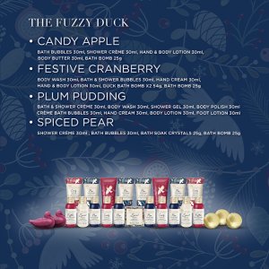 Tělové mýdlo 2×30 ml Sprchový krém 2×30 ml Pěna do koupele 3×30 ml Krémová pěna do koupele 30 ml Sprchový gel 30 ml Krém na ruce 2×30 ml Tělové máslo 30 ml Krystaly do koupele 25 g Koupelový a sprchový krém 30 ml Krém na chodidla 30 ml Tělové mléko 30 ml Mléko na tělo a ruce 2×30 ml Šumivá bomba do koupele 2×54 g Šumivá bomba do koupele 3×25 g Tělový peeling 30 ml