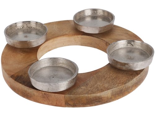 Adventní kovový svícen o rozměru 270 × 270 × 45 mm pojme 4 čajové svíčky a je umístěn na dřevěném kulatém podtácku. Svícen je stabilní, bezpečný a vhodný pro adventní dekorace i slavnostní stolní aranžmá.