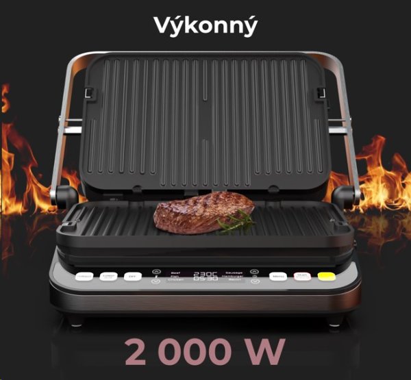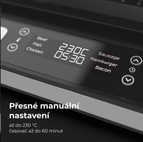 6 automatických programů: hovězí, rybí, kuřecí, klobásy, hamburgery, slanina