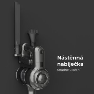 Kompaktní skladování a nabíjení – vysavač stačí připojit k nástěnné nabíječce.